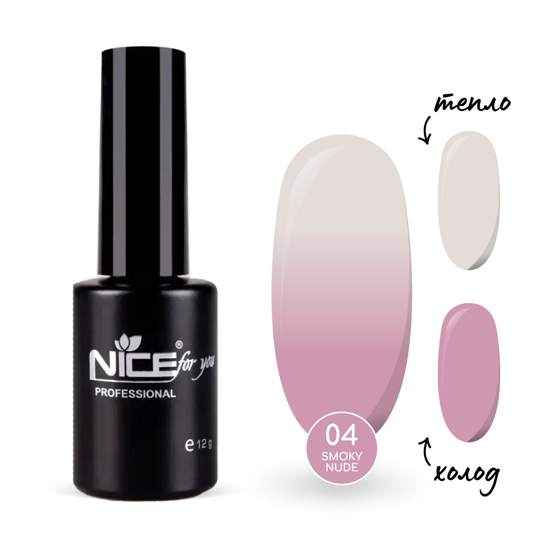 Smoky Nude Nice for you — це термо-чутливе покриття для нігтів, яке змінює свій колір, залежно від температури як навколишнього середовища (води, повітря), так і безпосередньо самої нігтьової пластини. При підвищенні температури покритий термо-базою вільний край нігтя збереже основний відтінок, а нігтьове ложе змінить колір на молочний. М'яка, еластична текстура та висока щільність пігменту термо-баз, забезпечує легке нанесення та ідеальне покриття, з економією часу як для майстра, так і для клієнта. Її можна використовувати як самостійне покриття, просто покривши топом!