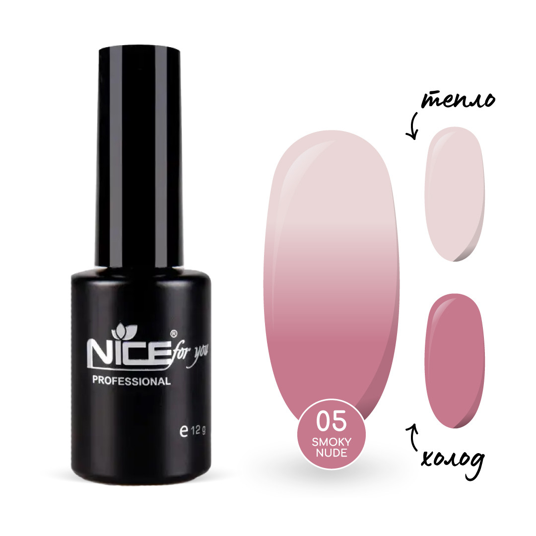 Smoky Nude Nice for you — це термо-чутливе покриття для нігтів, яке змінює свій колір, залежно від температури як навколишнього середовища (води, повітря), так і безпосередньо самої нігтьової пластини. При підвищенні температури покритий термо-базою вільний край нігтя збереже основний відтінок, а нігтьове ложе змінить колір на молочний. М'яка, еластична текстура та висока щільність пігменту термо-баз, забезпечує легке нанесення та ідеальне покриття, з економією часу як для майстра, так і для клієнта. Її можна використовувати як самостійне покриття, просто покривши топом!